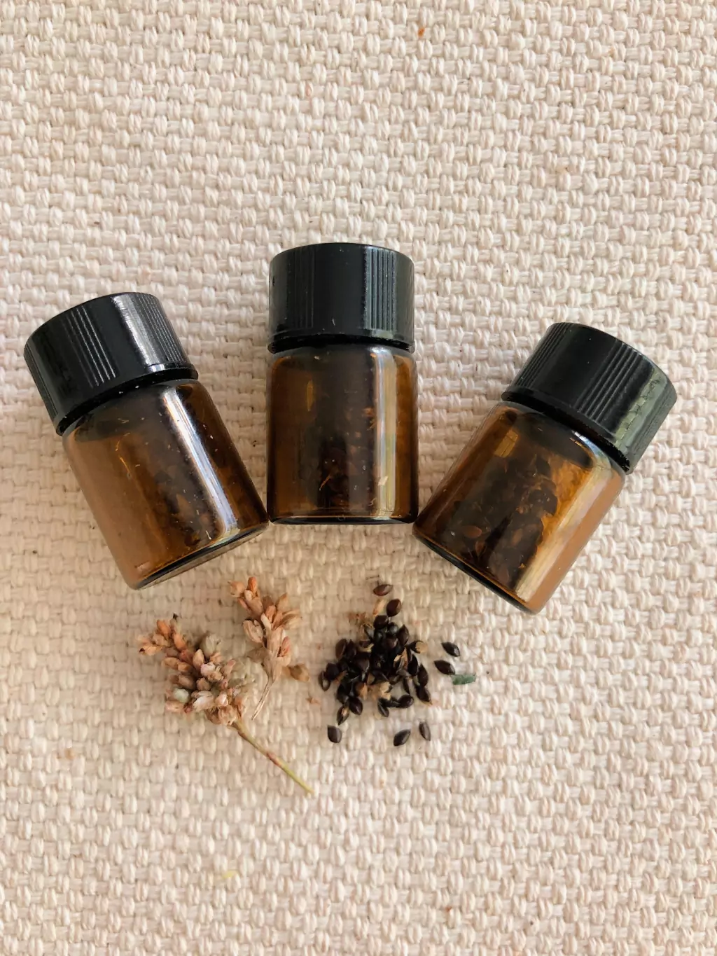 Semillas de índigo envasadas en frascos pequeños de cristal.